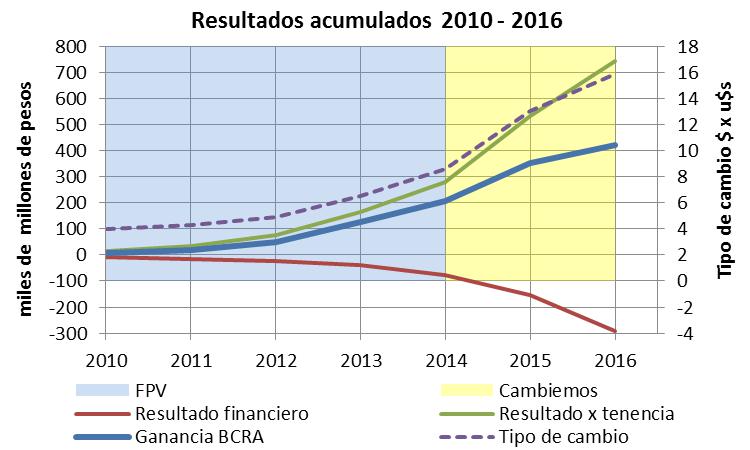 Si la cuenta se hace en dólares, para tratar de homogeneizar el valor de la moneda, esto arroja que entre el 2010 y el 2016, el Banco Central tuvo una pérdida por Resultados Financieros de 26,9 mil millones de dólares. Y una ganancia bruta por Resultados por Tenencia por efecto de las devaluaciones, de 76,6 mil millones de dólares. Lo que le reporto una ganancia neta final acumulada de 47,3 mil millones de dólares, que fueron íntegramente transferidas al Estado nacional.