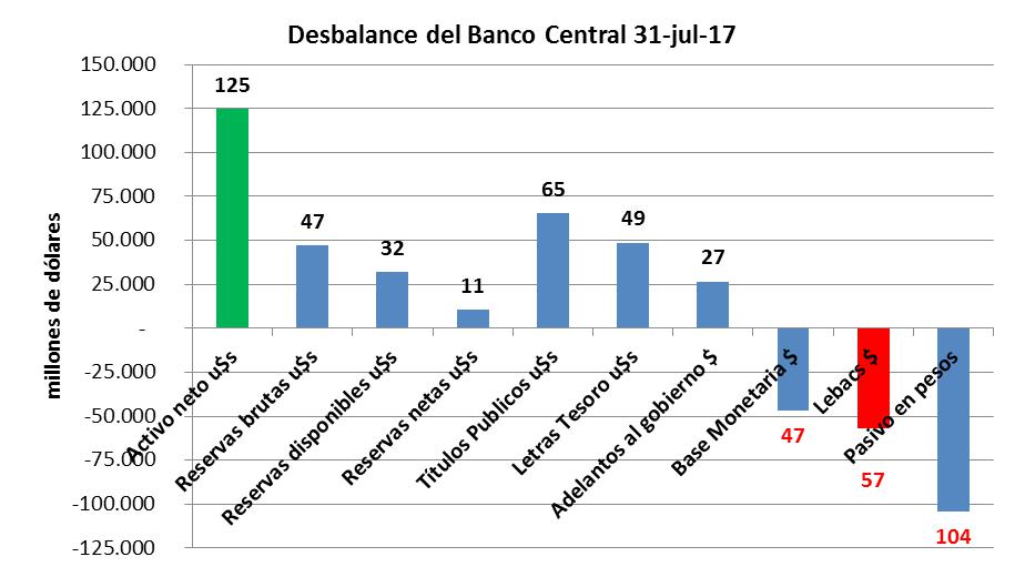 En el gráfico a simple vista, en el que se presentan los grandes rubros del balance del BCRA a fines de julio pasado, parece estar todo muy bien. Dado que el Central tendría supuestamente un activo neto de 125 mil millones de dólares, para responder con creces ante un pasivo en pesos de 104 mil millones, calculados con esa misma moneda.