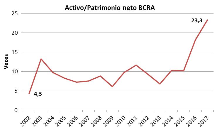 Como se puede ver en el siguiente gráfico, esta relación es enteramente inusitada, a la luz de los niveles históricos previos. Lo cual indica la delicadísima situación en que se encuentra el Banco, Central, que partiendo de una relación de 4,3 veces en el 2002, llegó a 10 en el 2015, registrando un ínterin un promedio de 8,8 veces.