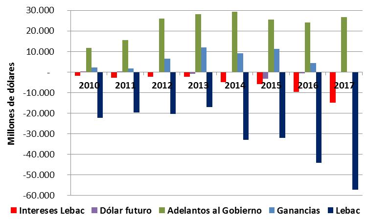 En dicho periodo los Adelantos Transitorios al Tesoro treparon hasta el equivalente a 27 mil millones de dólares, y las transferencias por Ganancias al Estado sumaron el equivalente de 47 mil millones de dólares, totalizando así entregas equivalentes a 74 mil millones de dólares.