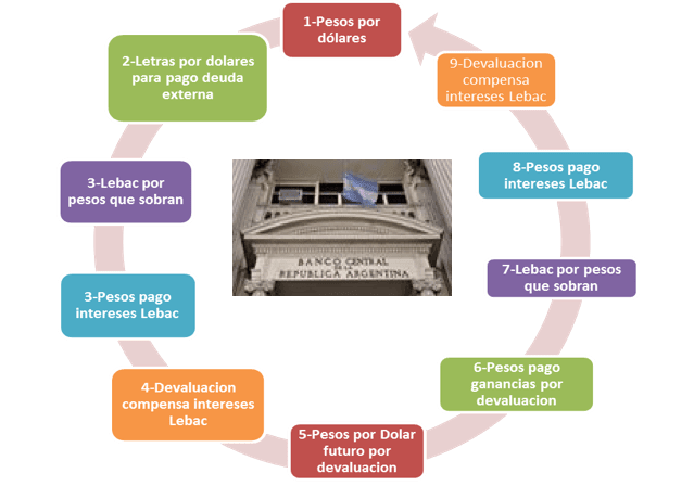 El siguiente esquema muestra el círculo o espiral viciosos en que se fue hundiendo el Banco Central durante el kirchnerismo y el macrismo. En él en un primer paso, el central compra dólares emitiendo pesos. En un segundo paso, le cede esos dólares a su dueño, el Estado Nacional, para el pago de la deuda externa, a cambio de Letras del Tesoro. En un tercer paso, ante la abundancia de pesos sin respaldo, rescata los pesos, emitiendo Lebac (Letras del Banco Central).