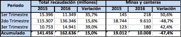 En detalles, en los tres primeros trimestres del año 2015, cuando estaban las retenciones, las empresas mineras y canteras pagaron ganancias al fisco por 19 mil millones de pesos. En el 2016, para el mismo periodo (últimos datos disponibles) luego que el gobierno de Macri quitara las retenciones, la recaudación por este impuesto cayó a 10 mil millones. Es decir, como se puede ver en el siguiente gráfico, tuvo una sustancial merma del 47%.