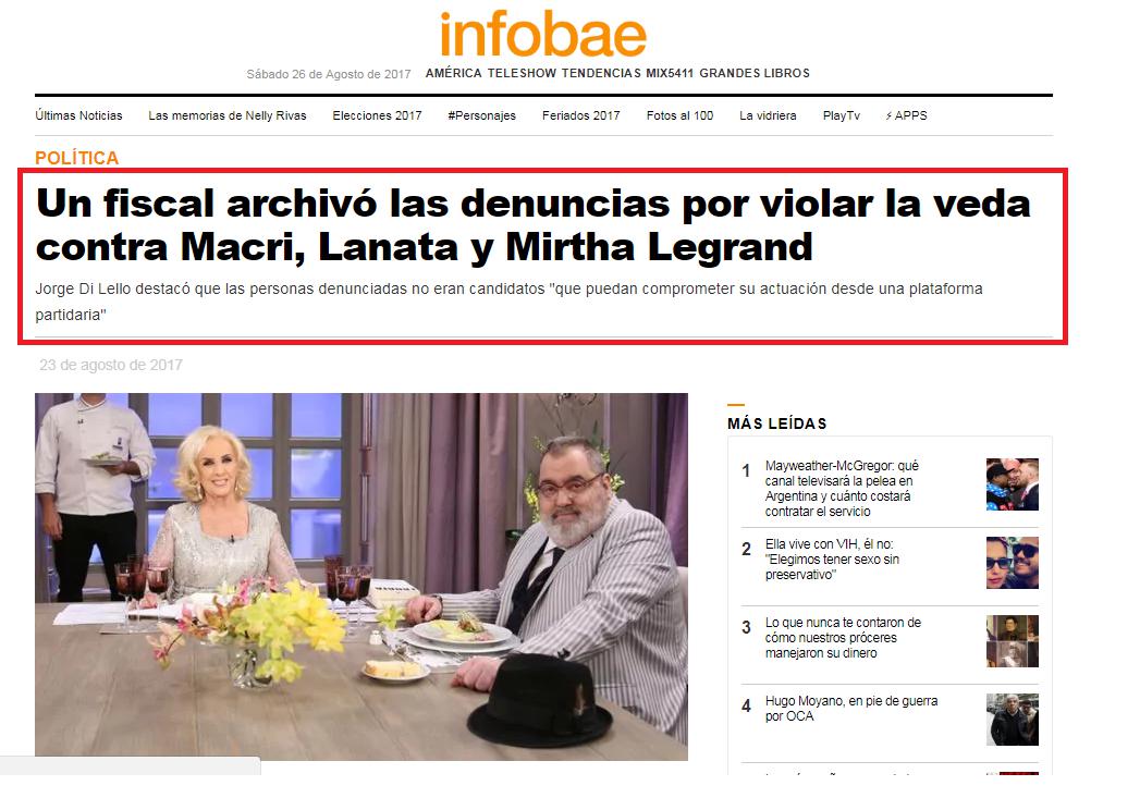 Luego, el sábado 12 de agosto, un día antes de las PASO, la entrevista fue difundida y analizada en el programa de Mirtha Legrad que se emite por Canal 13 (Clarín) y tenía como invitado exclusivo al periodista Jorge Lanata. El detractor más notable del kirchnerismo, desde que cerró el diario Crítica y se enroló en las huestes de Héctor Magnetto. Lo cual motivó una denuncia por violación a la veda electoral, que fue archivada por el benevolente fiscal electoral Jorge Di Lello quien consideró que ni Vidal, ni Brancatelli, ni Lanata, ni Legrand eran candidatos.