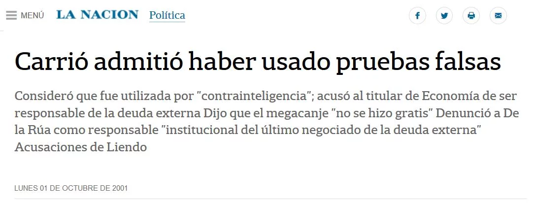 A fines de septiembre de 2001, Carrió admitió la posibilidad de haber sido objeto de una operación, como finalmente se comprobaría. Terminó siendo acusada por Domingo Cavallo por falsificación de documento y falso testimonio. “Lo hice con la convicción de que era documentación verídica y que no podía esconder porque en ese caso incumplía el mandato de funcionaria”, se había defendido Lilita.