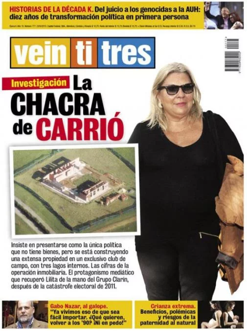 En mayo de 2013, con el avance de FAUNEN en plena época electoral legislativa, la hoy extinta Revista Veintitrés, que en ese entonces la manejaba el grupo empresarial oficialista Sergio Szpolski, publicó en la portada de una de sus ediciones el título “La chacra de Carrió”. Se trató de un informe sobre la compra de una parcela, donde la dirigente de la Coalición Cívica construiría una vivienda, y que el artículo apuntaba a una posible incompatibilidad, en base a lo que ganaba como diputada nacional.