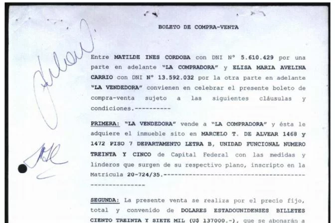 “El precio total de la operación ascendió a 49 mil dólares. De esta cantidad, 30 mil dólares corresponden al valor de la parcela y los restantes 19 mil dólares son pagados por el valor de la acción del Club de Campo. De acuerdo con la escritura con fecha del 29 de febrero de 2012 –que la propia Carrió reproduce en su sitio web–, se acuerda pagar estos 49 mil dólares de la siguiente manera, 9.800 dólares en el momento de la firma del boleto y el saldo de 39.200 dólares en 48 cuotas mensuales, iguales y consecutivas de 816 dólares, ‘o entregando la cantidad de pesos de curso legal, equivalente a multiplicar la cantidad de billetes dólares de cada cuota por el valor que publique el Banco de la Nación Argentina para operación de cambio tipo vendedor’, según se aclara en la escritura».
