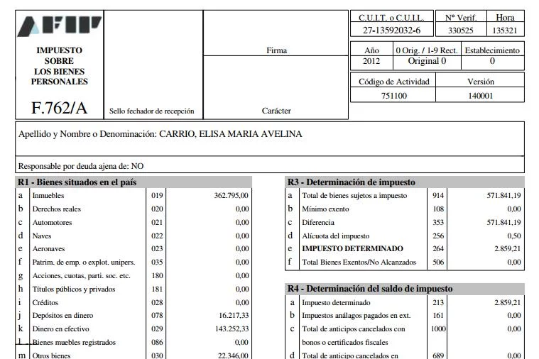 Para la revista, a eso había que sumarle los costos de la construcción de la vivienda: «Una construcción así, de acuerdo con consultas realizadas, puede significar un costo final de unos 400 mil dólares. (…) En su declaración jurada correspondiente al período 2012, Carrió declara que sus ingresos –brutos– por la Cámara de Diputados fueron anualmente de 478.453 pesos. En su última declaración de Bienes Personales –que Lilita subió a Internet–, la legisladora dice que tiene bienes inmuebles en el país por un total de 362.795 pesos”.