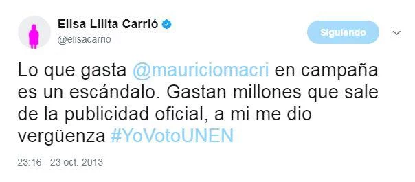 -2011, sobre los candidatos a presidente: “Hay dos candidatos que garantizan la impunidad. Cristina por un lado, con todos los negocios del kirchnerismo, de su propio esposo. Y Macri, por todos los negocios de su padre (Franco Macri) con el kirchnerismo, y de su primo (Ángelo) Calcaterra con el kirchnerismo. No olvidemos que Calcaterra es socio de Lázaro Báez”. (Radio La Red)