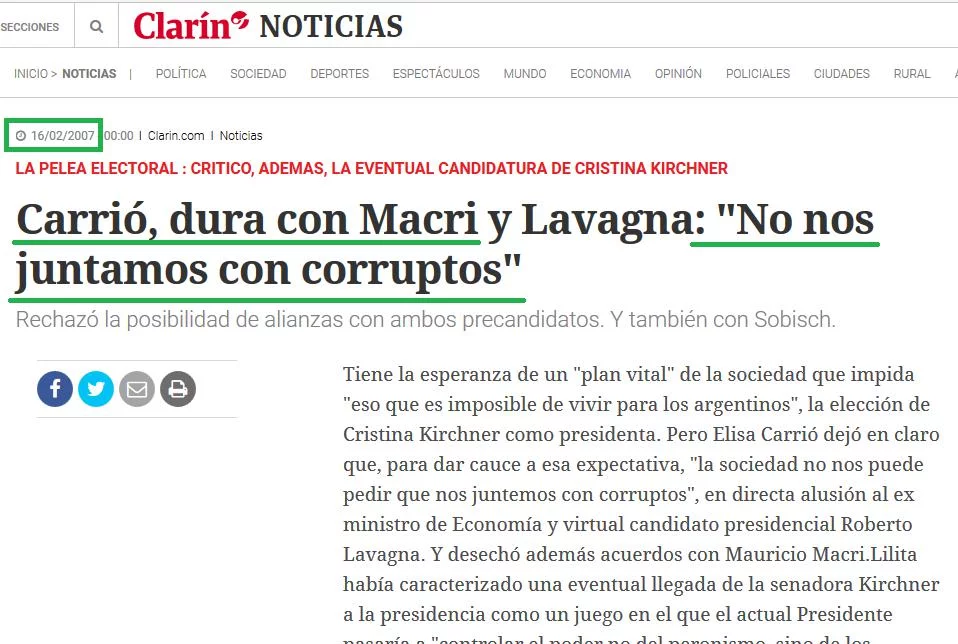 -2007, sobre posible alianza con Macri o Jorge Sobisch: «No es lo mismo Carrió que Macri; no es lo mismo Carrió que Sobisch. No pidan un rejuntado para un picadito de fútbol en la esquina. Se trata de cambiar un país. (…) La sociedad no nos puede pedir que nos juntemos con corruptos (…) Yo recuerdo que en un tiempo ser militar era una forma de acceder a la presidencia; ahora una forma de acceder a la presidencia es ser presidente de un club de fútbol, y eso marca la ligazón entre política, dinero y negocios” (Entrevista con M. Ruiz Guiñazú, Radio Mitre)