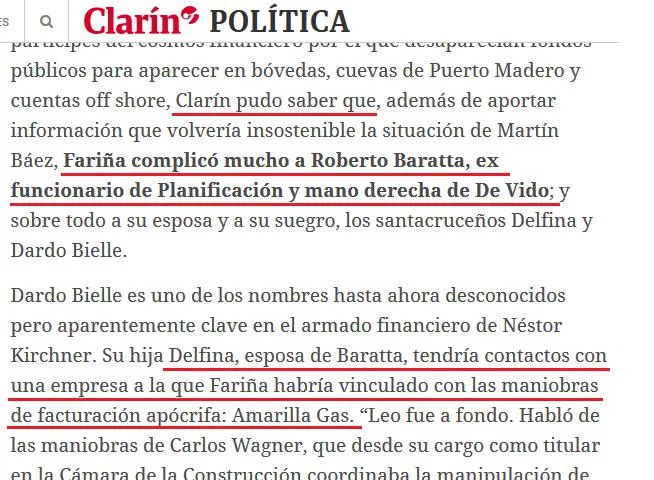 Por si fuera poco, se sospecha que Amarilla Gas ha sido una de las tantas empresas que sacaron facturas truchas a nombre de Austral Construcciones, la nave insignia de Lázaro Báez. Esto se acrecentó a partir de una publicación de Clarín, de abril de 2016, tomando fragmentos de las declaraciones de Leonardo Fariña, supuesto “valijero” de Báez, que mencionó la posibilidad de “las maniobras de facturación apócrifa” de Amarilla Gas.