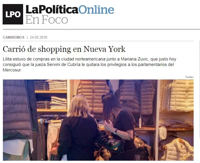 Mientras tanto, Lilita sigue gozando de sus placenteros viajes a distintos puntos del planeta, comprando ropa de alto valor, durmiendo en hoteles de lujo, y degustando la gastronomía fina, de la mano de su amiga Lili y su ahijada política Zuvic. Estándar de vida que en relación a cualquier otro funcionario público, ya habría despertado sospechas y denuestos. No obstante que declara un patrimonio inferior a la de muchos otros funcionarios con título de abogado, sin tener un automóvil propio, y llegando a gatas al pago del alquiler de su vivienda.