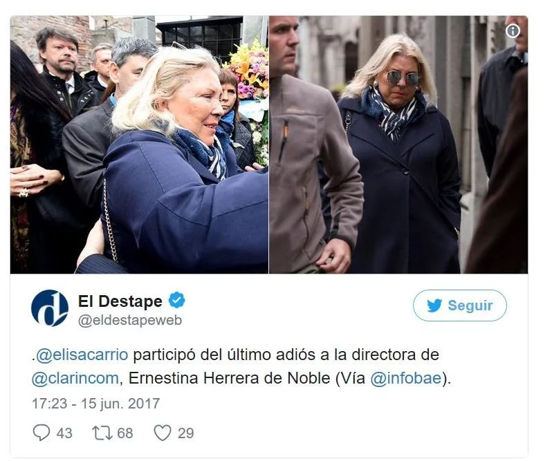 Que luego se puso en evidencia, con la cerril defensa que hizo Lilita de la inexplicable y sospechosa postura adoptada por los hijos de Ernestina Herrera de Noble, de negarse durante largos años a cotejar su ADN con el Banco de Datos Genéticos de familiares de desaparecidos durante la dictadura. A la que luego súbitamente desistieron tras los cambios que acaecieron de dirección que de ese banco de datos. Y tuvo una nueva evidencia con las condolencias y participación de Lilita en el reciente sepelio de Herrera de Noble.