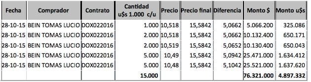 Como si fuera poco, el hijo y socio de Bein, Tomas Lucio, pese que el estudio asesoraba a Scioli, tras el resultado de la primera vuelta electoral del 2015, apostó nada menos que quince millones de dólares al Dólar Futuro. Lo cual tras la asunción del presidente Macri, inmediatamente después en febrero del 2016 le reportó una ganancia de nada menos que 76 millones de pesos, equivalente a casi cinco millones de dólares, como se puede ver en el siguiente extracto. Como para no estar contento Bein haciendo trulala con Bonelli.