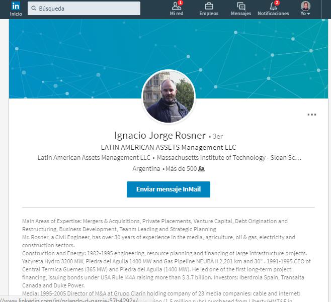La cuenta de Linkedin de Rosner tambalea entre los idiomas castellano e inglés. Y deja explícito sus pasos en el mundo empresarial local e internacional.