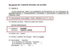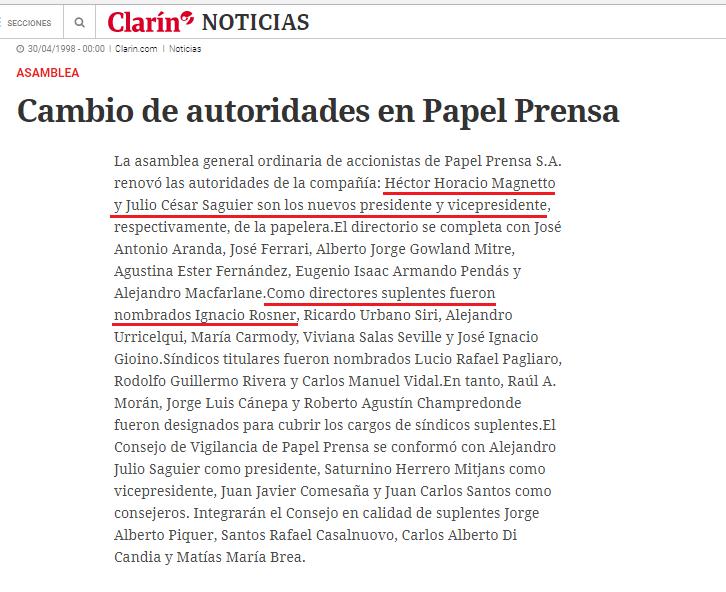 De hecho, según la ficha que Papel Prensa le entregó a la Comisión Nacional de Valores, Rosner figuraba también como director suplente de CIMECO el 28 de abril de 2003. Tres días antes, figuraba como titular del diario Los Andes, de la provincia de Mendoza, el otro importante diario del interior que compró el Grupo Clarín, de la mano de CIMECO. Dos semanas después, el 13 de mayo, Rosner asumiría como titular dentro del directorio del matutino cordobés. Lo que se puede decir que Rosner apesta a grupo Clarín.