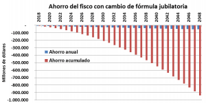 Con igual procedimiento se puede estimar groso modo el ahorro fiscal que reportará al estado, este insincero, inusitado, e improvisado recorte de haberes. Partiendo de un gasto en seguridad social previsto para el 2018 de 1,34 billones de pesos, equivalente a 75.000 millones de dólares a un tipo de cambio de $ 18, y un crecimiento etario de la clase pasiva de un 1,1 % anual, cuyos resultados se pueden observar en el siguiente gráfico.