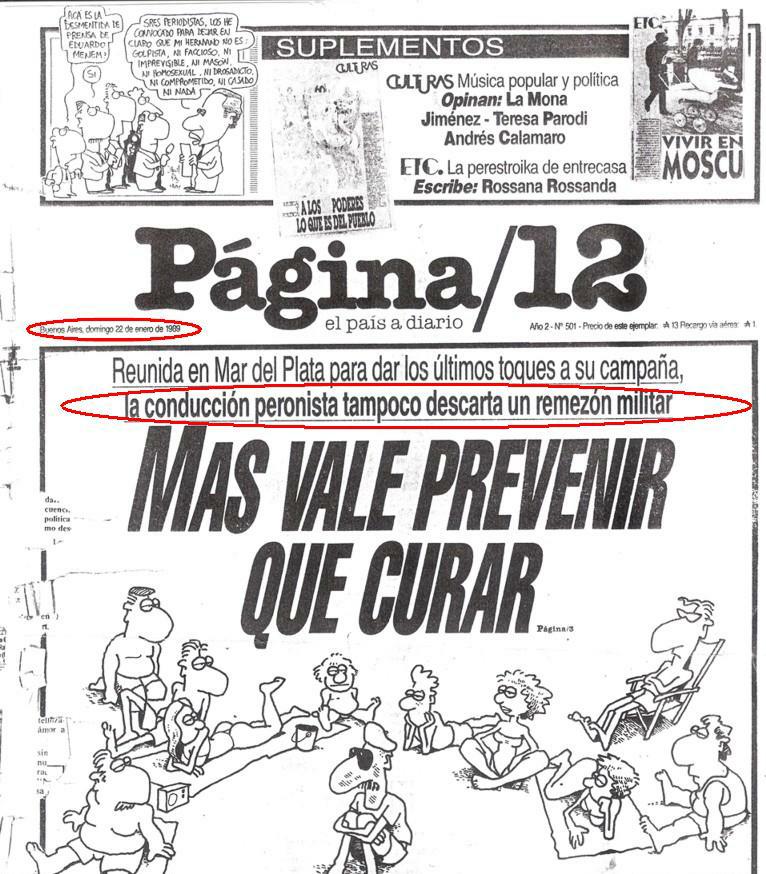 Luego de publicado hasta la fecha en que ocurriría el golpe, esta saga de notas en línea con el relato del MTP, alcanzó su cúspide el domingo 22 de enero, 24 horas antes del copamiento del cuartel. Ese domingo, dos días antes del supuesto golpe menemista-carapintada anticipado por Burgos, cuando más se lee el diario, en su tapa, cuyo diseño era exclusividad única de Lanata, Pagina 12 publicó una nota titulada “Más Vale Prevenir que Curar”. Sobre él, una volanta que decía “Reunida en Mar del Plata para dar los últimos toques a su campaña, la conducción peronista tampoco descarta una remezón militar”. O sea, además de apoyar explícitamente el inminente arribo de un golpe, el ahora periodista republicano de Clarín, le estaba diciendo a los militantes del MTP, lectores número uno de su diario, “vamos a tomar el cuartel muchachos porque se puede venir algo peor”