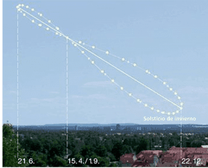 La trayectoria que describe el sol, tomada en el mismo sitio y a la misma hora, se conoce como analema. La que como se puede ver en la siguiente imagen correspondiente al hemisferio norte, toma a lo largo del año la forma de un ocho. Para el hombre primitivo era trascendental ver si al llegar a su mínimo, el Sol seguía cayendo, o empezaba a recuperarse, lo cual lo llenaba de júbilo, siendo estas las fiestas del solsticio invernal que existen en todas las culturas. Tanto del hemisferio Norte como el Sur, mostrando esto la crucial dependencia de lo humano ante la energía proveniente del Sol.