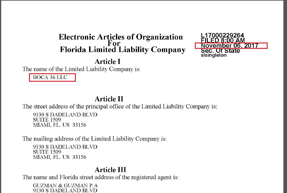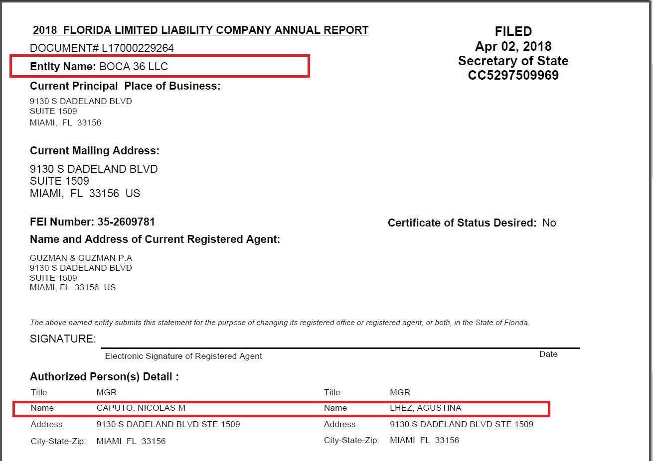 En el documento de abajo se encuentra el registro de BOCA 36 LLC, con los nombres que conforman el directorio, en el hasta ahora único reporte anual que han presentado al distrito de Florida, con la asistencia de la consultora Guzman & Guzman.
