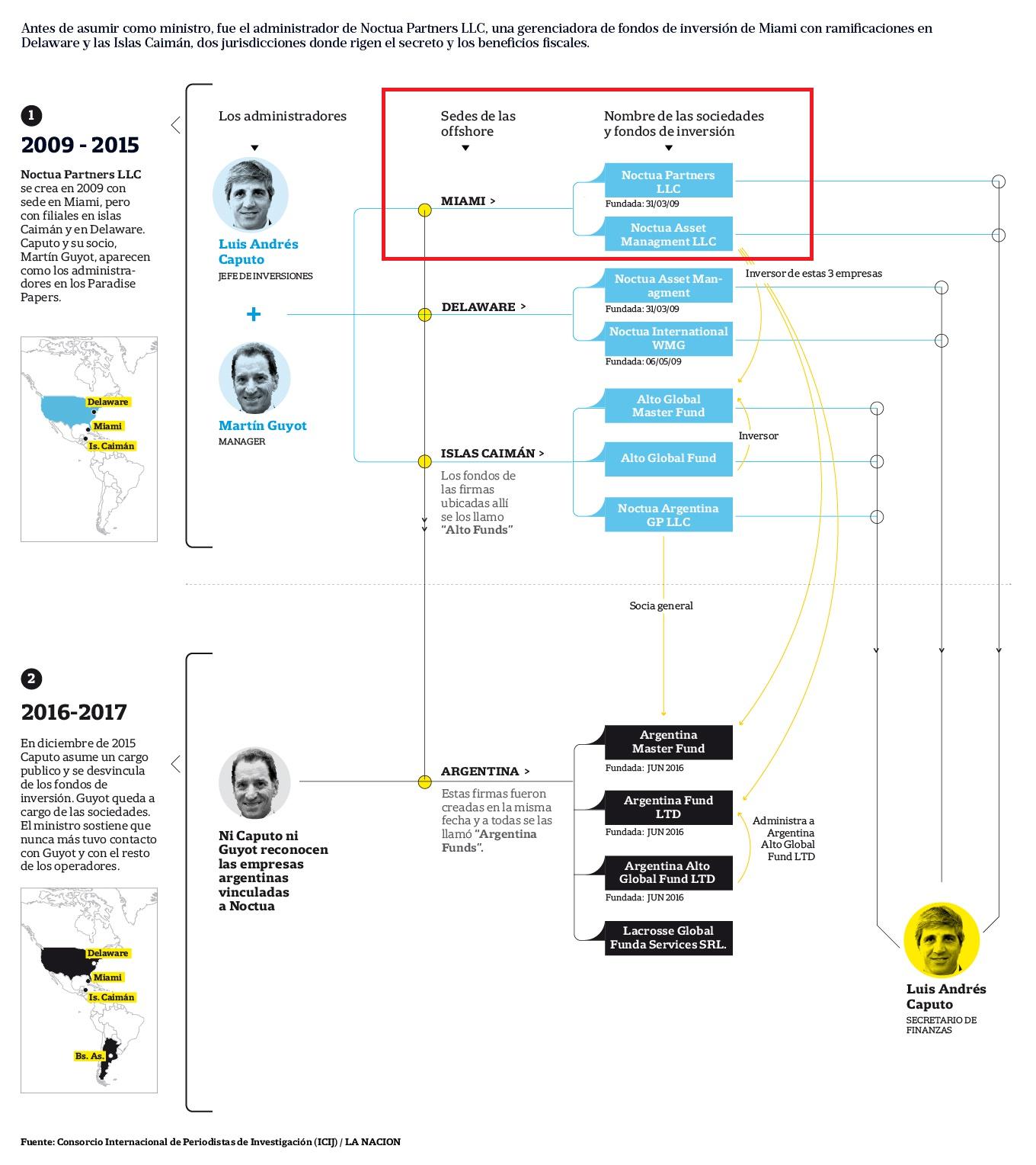Al respecto, parte de las sociedades que lo involucran a Luis Caputo en el marco de los Paradise Papers, como Noctua Partners LLC y Noctua Asset, también tienen sus registros oficiales en Florida. El mismo donde Nicky registró las suyas, como se puede visualizar en la infografía que subió el diario La Nación.