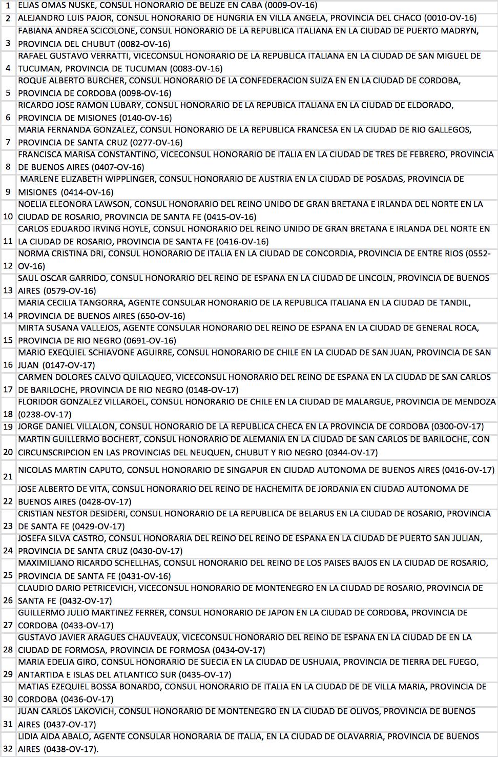 El anterior Gobierno a lo largo de doce años. mediante cuatro leyes sancionadas entre el 2007 y el 2009 (26.234, 26.488, 26.507, 26.506) nombró un total de 44 cónsules honorarios en Argentina. 16 en la primera, 4 en la segunda, 11 en la tercera, y 13 en la cuarta. Mientras que el actual Gobierno de un saque pretende aprobar conforme ese listado, 32 cónsules honorarios, como si con ellos le fuera la vida.