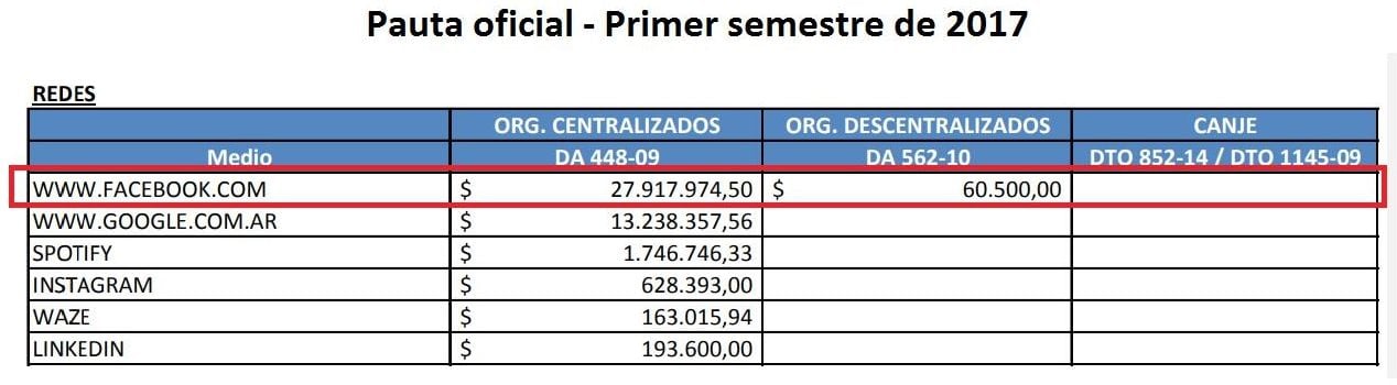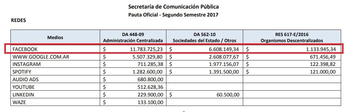 Luego, en los primeros seis meses del año 2017, el Estado Nacional decidió asignar pautas hacia otras redes sociales como Instagram, Spotify y Linkedin. Pero Facebook se mantuvo en el podio de la mayor parte de esa torta, muy por encima de Google. Si sumamos todo lo repartido a las mencionadas plataformas de internet nos da un total de $ 43.948.587,33.