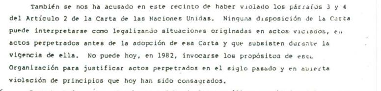 Pero además fundamentalmente, aceptó que Argentina había violado la Carta de la ONU usando la fuerza, argumentando nada menos que ella no regía para situaciones anteriores a su creación, tal como se puede apreciar en el siguiente facsimil extraído de su alocución: «se nos ha acusado haber violado los artículos 2.4 y 2.3 de la Carta de las Naciones Unidas… Ninguna disposición de la carta puede interpretarse como legalizando situaciones originadas en actos viciados, en actos perpetrados antes de la adopción de esta carta, y que subsisten durante la vigencia de ella…».