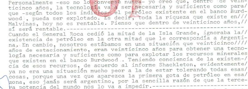 Conforme el facsimil de su declaración que se puede ver seguidamente, donde pronostica que el mismo sería explotable veinticinco años después. Y advierte que “una vez que aparezca la primera gota de petróleo en esa zona, eso jamás será argentino, por la sencilla razón de que la tercera potencia del mundo nos lo va a impedir”.
