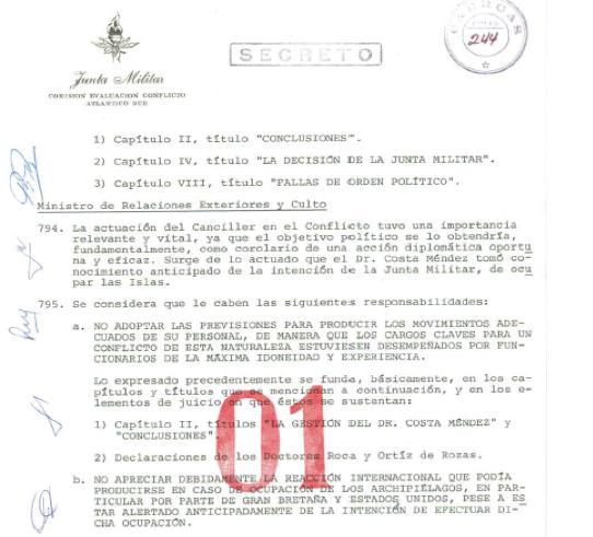 «La actuación del Canciller en el Conflicto tuvo una importancia relevante y vital, ya que el objetivo político se lo obtendría, fundamentalmente, como corolario de una acción diplomática oportuna y eficaz. Surge de lo actuado que el Dr. Costa Méndez tomó conocimiento anticipado de la intención de la Junta Militar, de ocupar las Islas. (pgf 794). Se considera que le caben las siguientes responsabilidades (pgf 795):