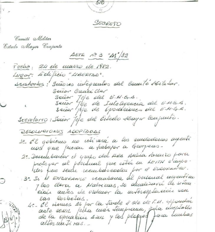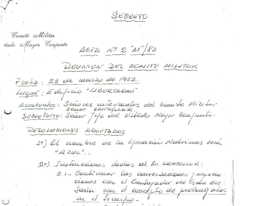 Justamente el día anterior 23 de marzo, como consecuencia del notable escalamiento del incidente de la islas Georgias por parte del Reino Unido, la Junta Militar con la firma de Galtieri, Leandro Anaya, y Lami Dozo, decidió mediante el Acta Nº 2 “M”, llevar adelante la operación “Azul” de recuperación de las islas Malvinas.