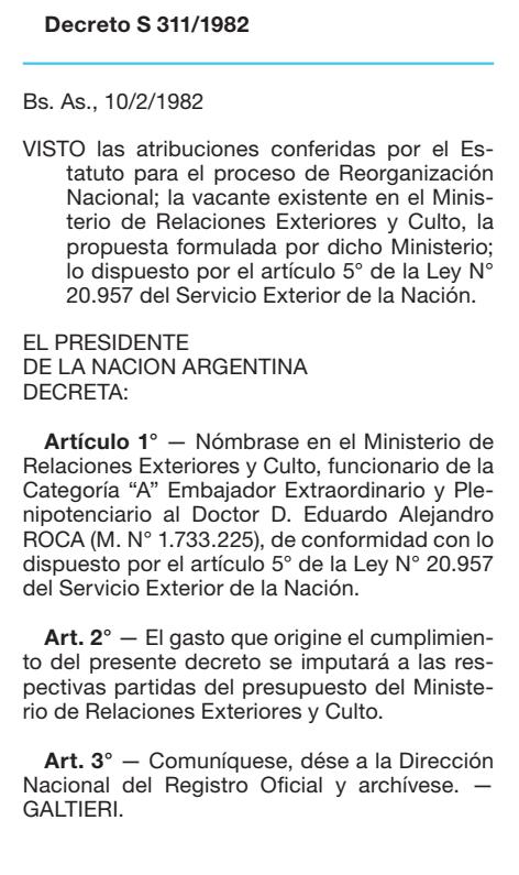 A fines de diciembre de 1981, se anunció formalmente que se había designado a Roca Hunter como embajador ante la ONU. Sin embargo inexplicablemente, su nombramiento recién se formalizo a instancias de la cancillería cuarenta días después, el 10 de febrero de 1982, mediante el decreto secreto 311/82, como se puede apreciar en la siguiente imagen del mismo.