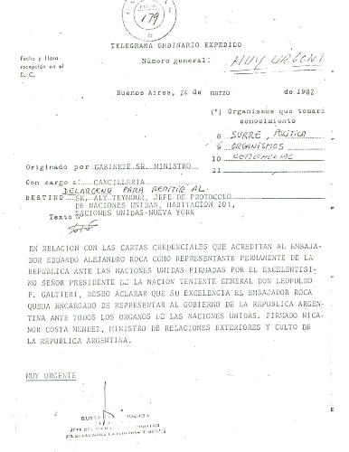 Y que luego al comentarle esta confidencia a Costa Méndez, este le expresó que “el presidente me había confiado un secreto muy grande”. Y así en concreto, Roca Hunter recién acredito sus credenciales ante la ONU, el 24 de marzo de 1982, como se puede ver en el siguiente facsímil extraído del informe Rattembach.