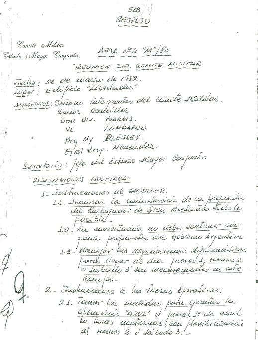 Así el 26 de marzo se concretó el Acta nº 4 “M” de la Junta Militar, con la presencia del canciller Costa Méndez, que determinó que la operación “Azul” se debía concretar “el jueves 1 de abril en horas nocturnas, con flexibilización en viernes 2, y el sábado 3”. Además se lo instruyó a Costa Méndez que demorara la respuesta a la propuesta del embajador inglés todo lo posible, y que manejara “las negociaciones diplomáticas para llegar al día jueves 1, viernes 2, o sábado 3, sin inconvenientes en este campo”.