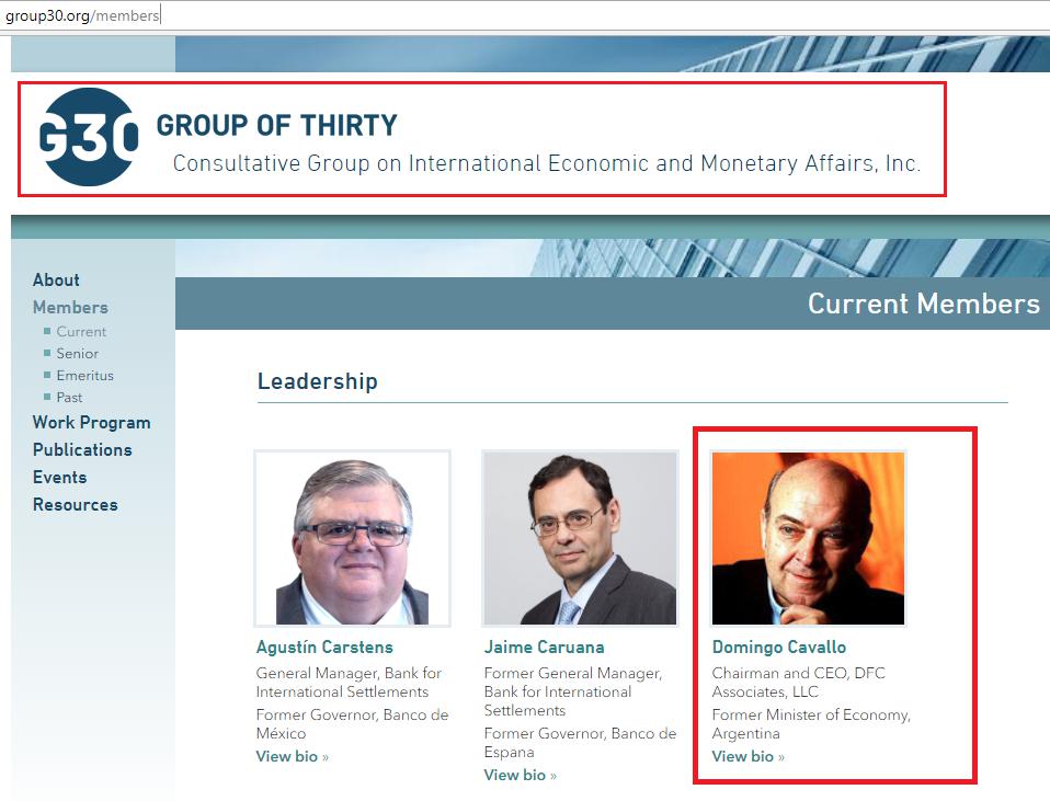 Este “think tank” que busca “profundizar la comprensión de las cuestiones económicas y financieras internacionales” tendrá en Argentina a Cavallo como uno de sus exclusivos y privilegiados miembros –http://group30.org/members-. Figura como ex ministro de economía de Argentina y presidente Ejecutivo de la consultora “DFC Associates, LLC”, con sede en la Ciudad Autónoma de Buenos Aires, dedicada al asesoramiento en temas financieros, cuyas siglas significan Domingo Felipe Cavallo. Y que está registrada como empresa offshore en el estado de Virginia, Estados Unidos, en el 2008, por el propio Cavallo, según consta en sus registros.