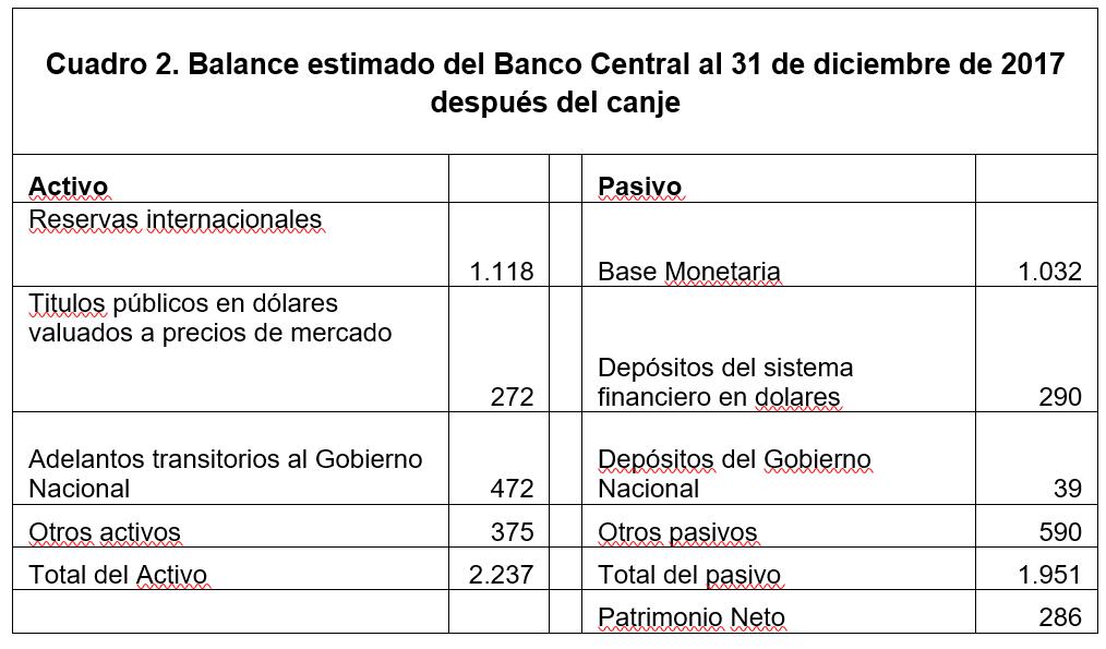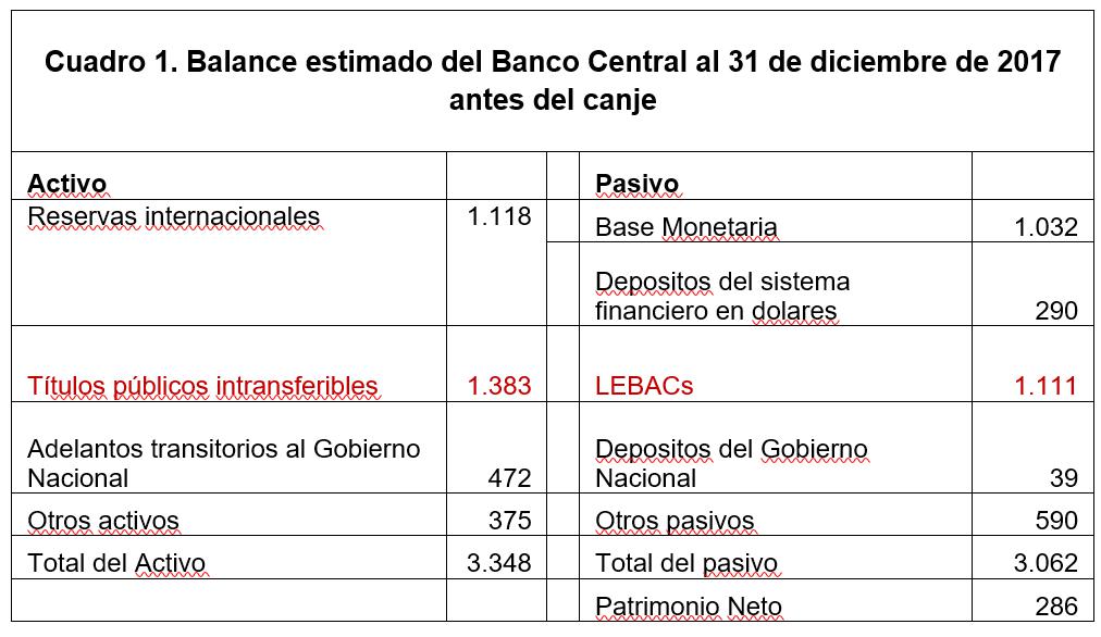 “El Tesoro debería emitir deuda pública por 1.383 miles de millones de pesos, imitando, en cuanto a características de las letras y bonos, monedas, plazos y tasas, al stock de deuda pública actual en manos del sector privado. Esta deuda debería ser canjeada por los 1.383 miles de millones de títulos públicos intransferibles que actualmente figuran en el activo del Banco Central”, agrega, mostrando un cuadro con los dañados balances del BCRA del 2017 por las Lebacs que se expone abajo.