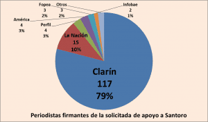 A los nombrados le siguen Perfil y América, con 4 firmas o 3 % del total cada uno. Luego con 3 firmas y un 2 %, viene FOPEA, que fue presidida por Santoro entre el 2002 y el 2007; y Otros, en el que figura María Alveolite, la productora de Santoro. Y finalmente aparece Infobae, con 2 firmas y un 1 %, medio que le hizo un extensísimo reportaje a D’Alessio como se verá seguidamente, presentándolo como un súper especialista en cuestiones de narcotráfico.