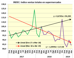 A la par que según el mismo INDEC el consumo, que es el principal componente del PBI, alcanzado al 70 % del mismo, viene barranca abajo desde marzo del año pasado. Tal como se puede apreciar en el siguiente gráfico del índice de ventas en supermercados, publicado por dicho organismo.