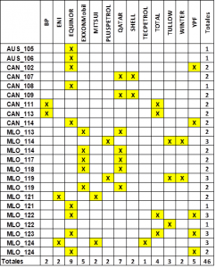 Mostrando las cuadriculas con cruz resaltadas con amarillo, los vínculos establecidos entre las distintas empresas participantes. Habiendo establecido 13 empresas en relación con 18 áreas adjudicadas, 46 vínculos societarios, que hablan de la densidad de la trama existentes en el cartel o cofradía petrolera. Con un promedio de 3,5 vínculos por empresa, 2,6 por cada área adjudicada, y 2 por cada oferta recibida.