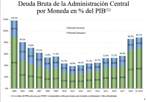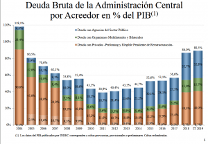 No obstante que se considera como un tope prudencial que la deuda publica no supere el 60 % del PBI, y que la deuda en divisas extranjeras no supere el 30 % del PBI. Habiendo llevado el actual gobierno este endeudamiento en divisas de un 37 % del PBI en el 2015, al 69 % del PBI a principios del 2019. Correspondiendo el 40 % a acreedores privados que han cesado de brindar refinanciaciones, y por eso la deuda con Organismos Multilaterales ha trepado a un 16 % del PBI, con los préstamos del FMI.