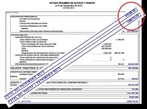 O sea poniendo a ellas, más que a su valor nominal, ya que el valor técnico de ellas es el valor nominal, más los intereses devengados por ellas, que como se dijo son muy exiguos. Asignándole así al 23 de septiembre al Banco Central un Patrimonio Neto positivo de 31.303 millones de dólares, contra los menos -6.562 millones que luce el balance real.