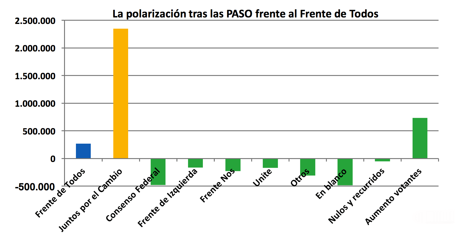 Por otro lado es notable la polarización que se habría dado, a los fines de impedir el triunfo del Frente de Todos, como se puede ver en el siguiente gráfico. Donde se exponen las diferencias que hubo en la reciente elección en base a los números del escrutinio provisorio, respecto los resultados de las PASO.