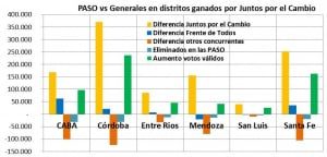 En el siguiente grafico se puede ver respecto esos seis distritos, la diferencia de votos que hubo entre ambas elecciones, en base a comparar el escrutinio definitivo de las PASO, y el provisorio de la reciente elección.