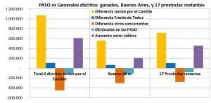 Los totales de los seis distritos antes reseñados que Juntos por el Cambio pintó de amarillos, arroja que hubo 1,07 millones de votos más para Juntos por el Cambio, y solo 104 mil votos a favor del Frente de Todos, o sea diez veces menos, con un aumento de 609 mil votos válidos. Los que sumados a los 453 mil votos provenientes de la Diferencia negativa de otros concurrentes, más los 113 mil votos de los partidos que no superaron las PASO, hacen una masa de 1,17 millones de votos, de los cuales el 91 % fueron a parar a Juntos por el Cambio, y solo un 9 % al Frente de Todos.