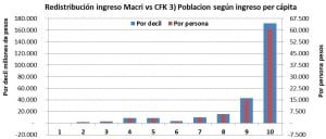 Respecto el ingreso a distribuir, nuevamente el correspondiente a CFK fue de 7,07 billones, y el de Macri de 7,33 billones, con un aumento del 3,7 %, inferior al crecimiento de la población. O sea un diferencia de 265 mil millones, de los cuales el 85 %, 225 mil millones fueron a parar a los deciles seis a diez.