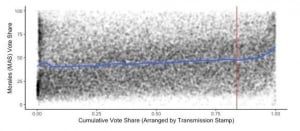 El informe presenta un gráfico lapidario, que se puede ver seguidamente, que muestra con la densidad de los puntos negros, como creció el voto a favor de Evo Morales en los últimos momentos del escrutinio, tras haberse este suspendido, llegando hasta el 100 % en muchas mesas.