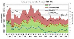 Llegando de esa manera en el 2015 el precio real de la soja, en términos de paridad con el de octubre del 2007, a ser de solo de 100 dólares por tonelada, contra los 336 del pico del año 2008. Muy por debajo del promedio registrado a lo largo del mandato de CFK de 198 dólares la tonelada (línea violeta).