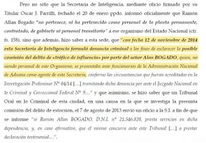 Al final de la nota también están las recientes declaraciones efectuadas radialmente, por quien dice haber sido el subordinado de Stiuso, Allán (Alian) Bogado. Quien desde el 2015 hace responsable a Stiuso, de haberle suministrado al fiscal Nisman la falsa prueba de que él era un agente especial “camporista” de la Presidencia, para precipitar la denuncia de este contra la presidenta CFK. Presentándolo como el eje esencial de ella, tal como se puede apreciar del siguiente facsímil extraído de la denuncia del fiscal.