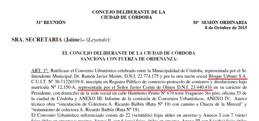 Para aprobar este convenio, denunciado por los concejales opositores de la ciudad de Córdoba, el Concejo Deliberante de Córdoba controlado por Cambiemos en el 2014 y 2015 dictó dos ordenanzas, autorizando modificaciones radicales al uso del suelo en esa zona. A cambio de obras por 2,7 millones de pesos, acordadas con la Municipalidad mediante un convenio y una addenda al mismo.