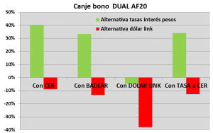 Lo que representaba respecto la otra alternativa del Bono Dual, basada en la tasa de interés, una mejora el 40 % en el caso el CER. De un 33 % en el caso de la BADLAR. De nada menos que un menos – 4,8 %, o sea una pérdida en el caso el dólar linked. Y de una mejora de un 34 % con el nuevo dual de CER o tasa de interés.