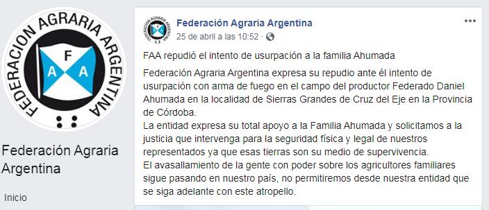 Conocido el hecho, la Federación Agraria Argentina expresó su repudio mediante un comunicado donde estableció “su total apoyo a la familia Ahumada y solicitamos a la justicia que intervenga para la seguridad física y legal de nuestros representados ya que esas tierras son su medio de supervivencia”.